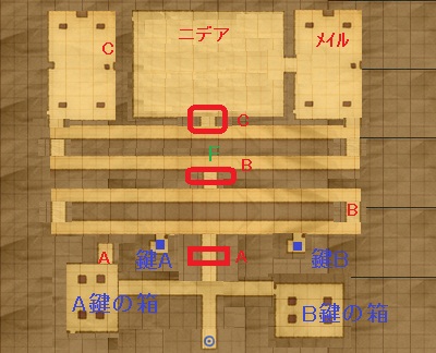 左右それぞれの壁を壊した場所に箱があり、その中に入り口近くの宝箱を開ける鍵が入っている。