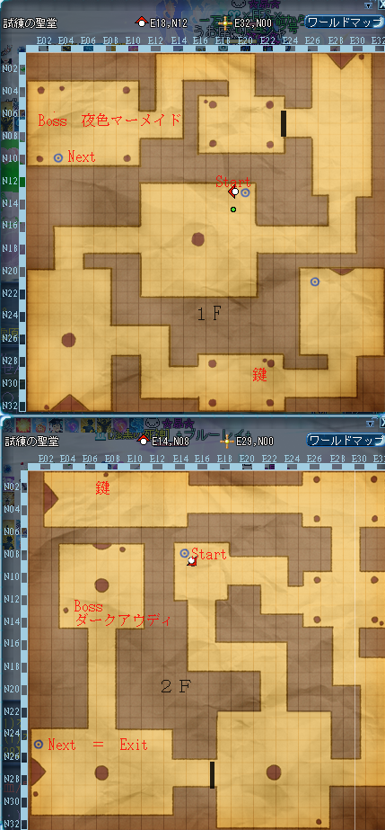 | 備考 | 箱を開けた人のみクエアイテム獲得、BOSS部屋の宝箱は鍵が必要、鍵はE18,N21 |